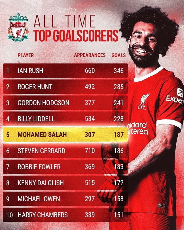 Другие знаменитые игроки, такие как Робби Фаулер, Кенни Далглиш и Майкл Оуэн, занимают седьмое, восьмое и девятое места соответственно, забив 183, 172 и 158 голов за свою яркую карьеру в «Ливерпуле».