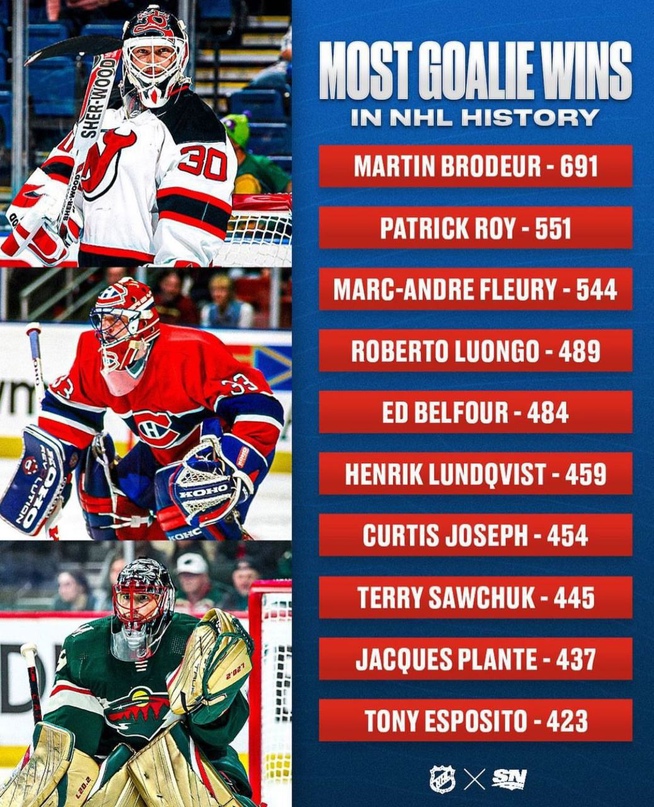 Насколько велик разрыв между Бродером и действующим лидером? Кто еще входит в топ-10 по количеству побед? Давайте посмотрим, какие вратари одержали наибольшее количество побед в истории НХЛ.